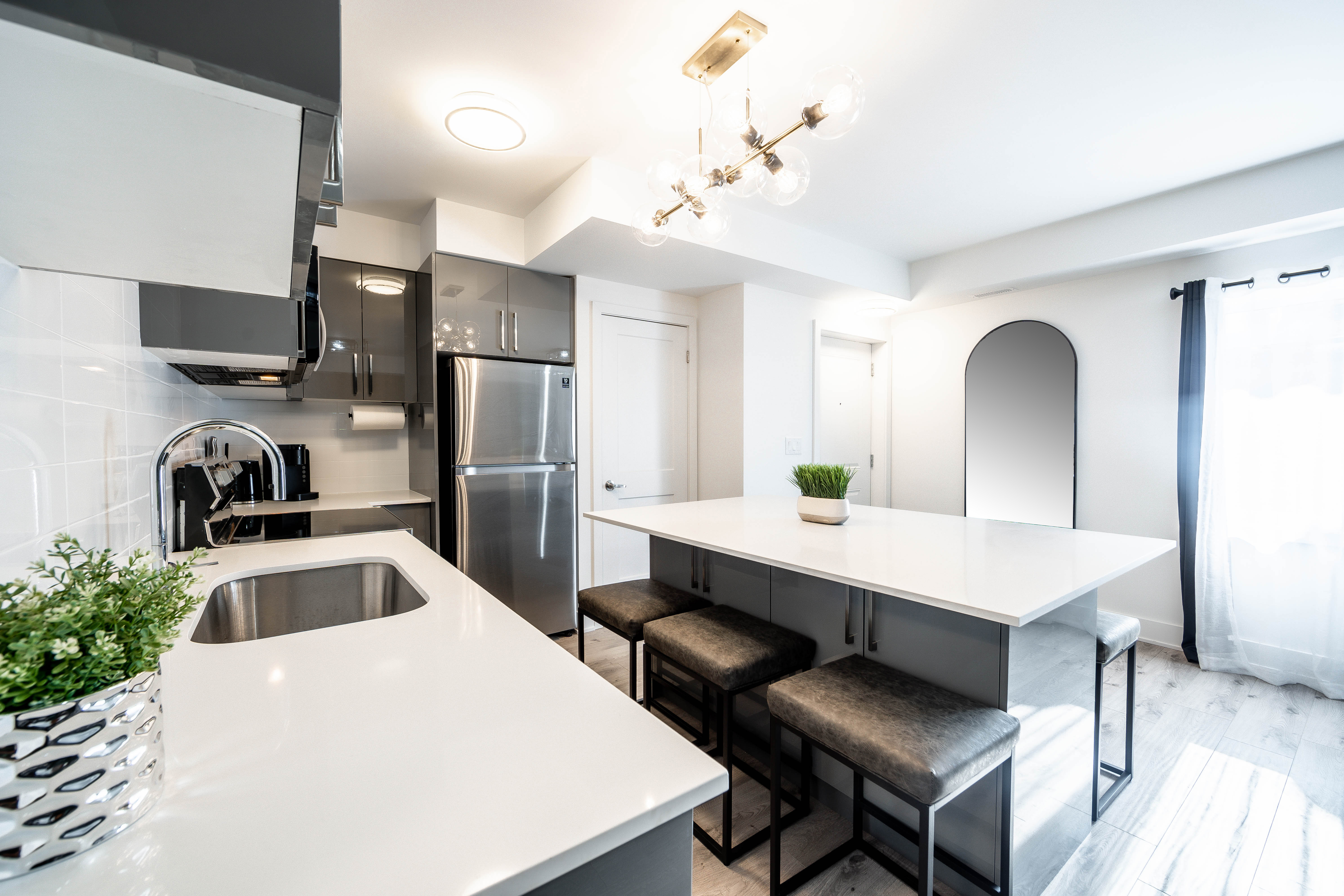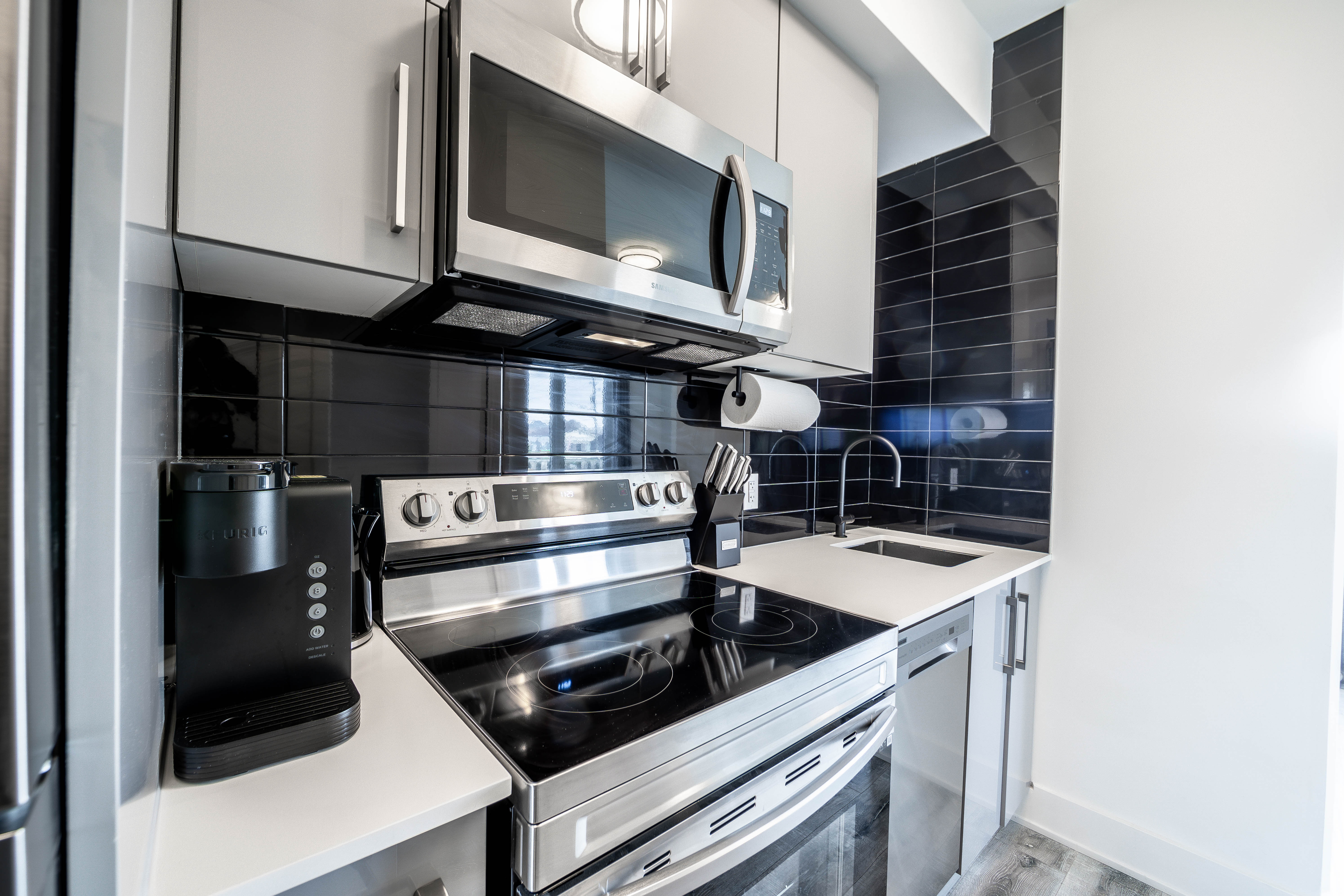 Your kitchen is the vibrant heart of your home—a space designed for connection, creation, and the energy of daily life. We’ve selected every finish for its perfect blend of modern style and lasting function. Sleek melamine laminate cabinets with contemporary metal hardware offer smart, stylish storage, while the durable hard-surface countertop provides a beautiful and easy-to-clean workspace.